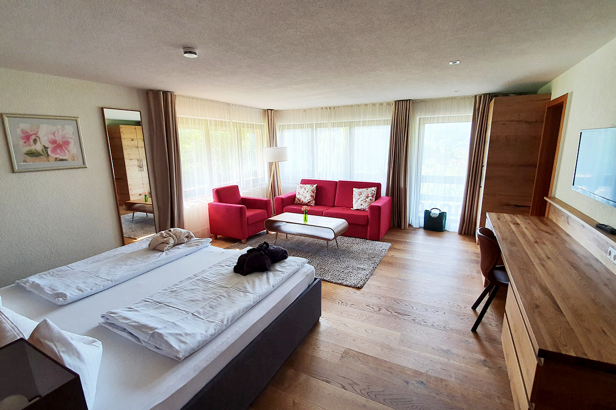 Das Zimmer erstreckt sich über 2 Etagen. Es gibt separate Eingänge zu beiden Etagen. Das untere Zimmer verfügt über einen Wohnbereich mit Schlafsofa, Balkon und Badezimmer. Der Schlafbereich befindet sich im oberen Bereich. Von dem gesamten Zimmer hat man einen wunderbaren Blick ins schöne Münstertal. W-LAN inklusive.